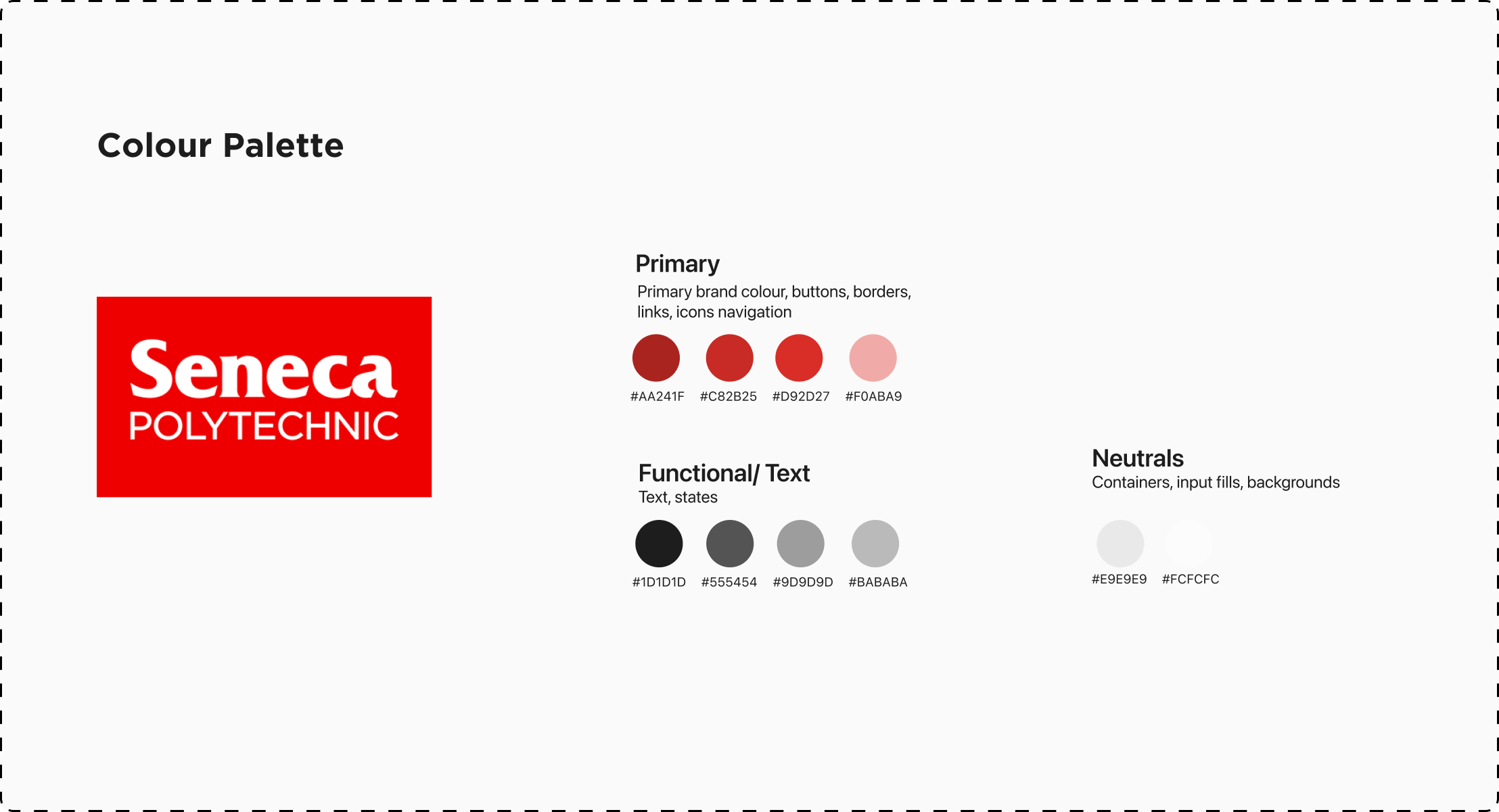 I used the Seneca College brand colour of red as interactive states helps the reader differentiate between text and interactive buttons and links.