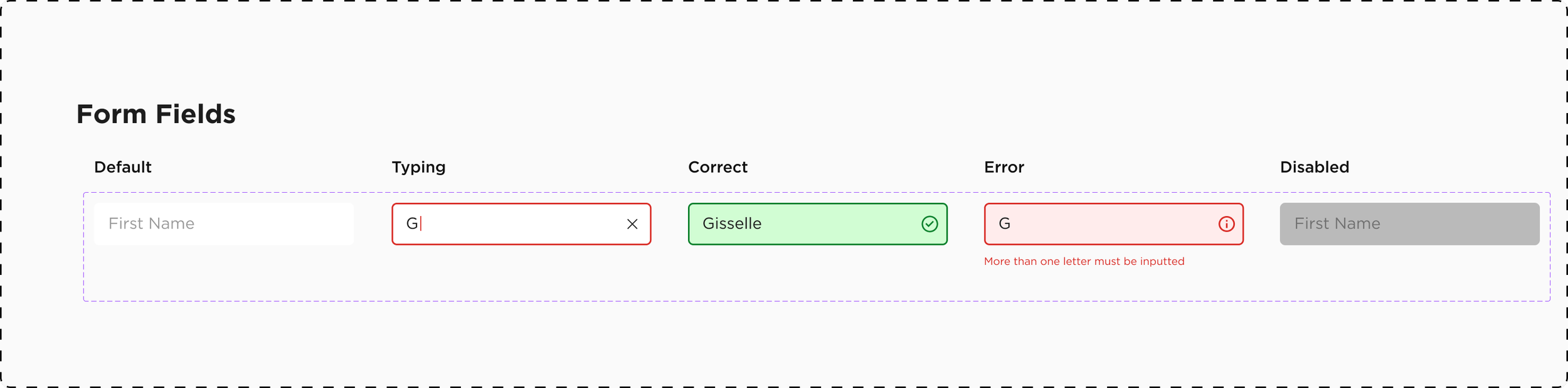 Form fields used a similar colour palette to buttons. Form fields were categorized into default, typing, correct, error, and disabled states.