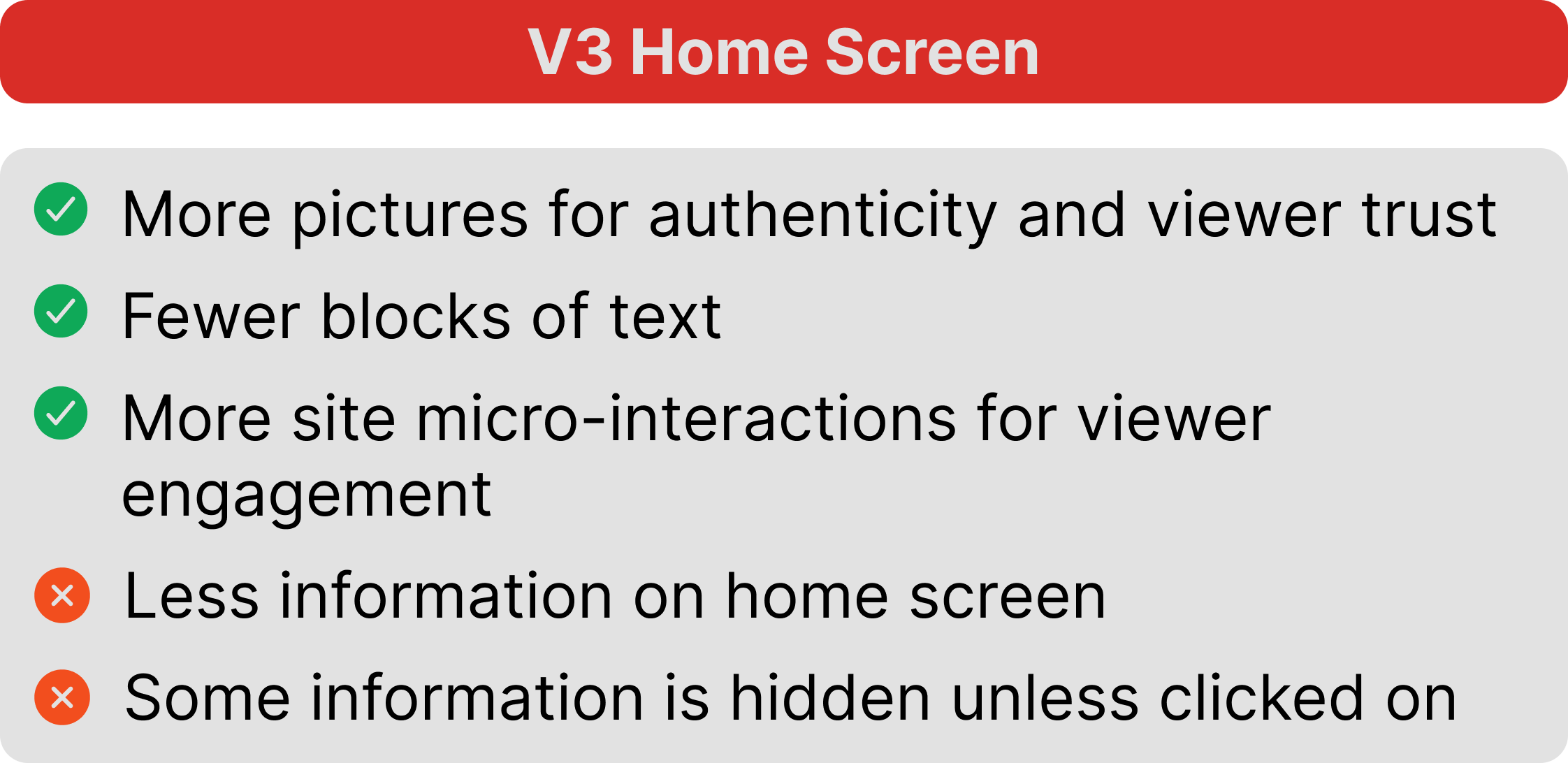 I consulted with the client to identify which information they thought to be most important and should reside on the home page. We conducted card sorting sessions to determine which page each information should reside and created new screens to sort other items. Additionally, we discussed the value proposition of each item, and placed the most important items highest on the site for visual hierarchy.