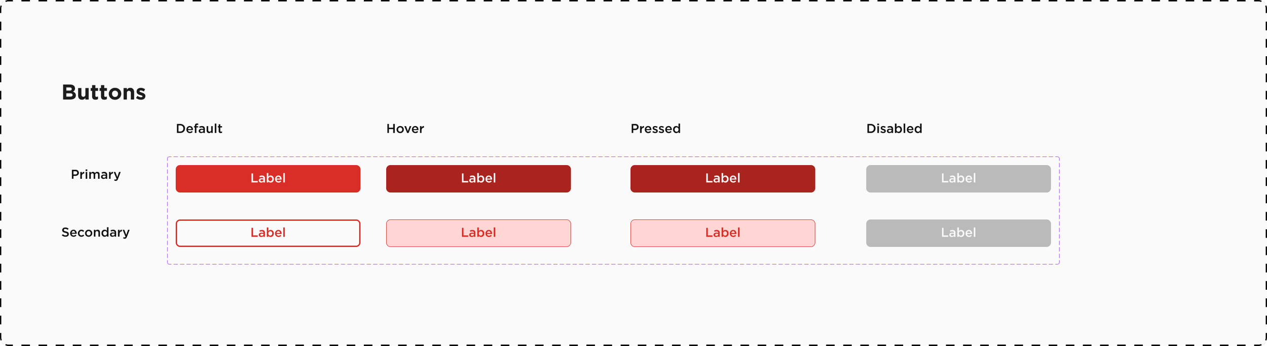 Buttons were categorized into two main types: primary and secondary buttons. Each button type was further categorized into default, hover, pressed, and disabled states.