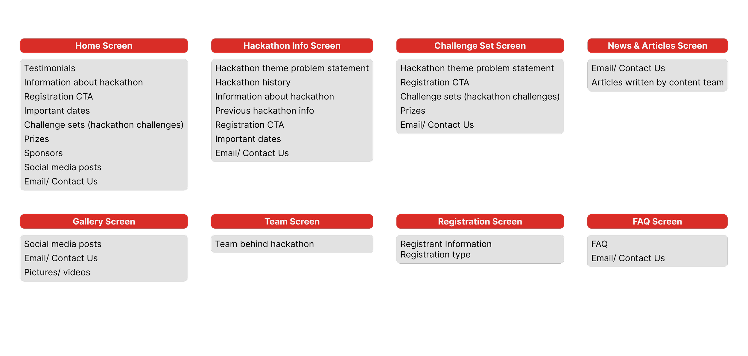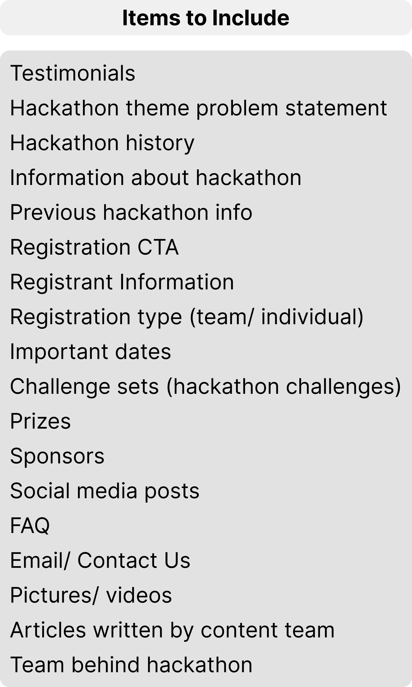 The client initially wanted the home page to act as a one-stop shop for all hackathon information. However, this resulted in a long home screen with large blocks of text and fewer pictures which may continue to discourage users from registering. In the final design provided to developers, we focused on using visuals to present information, and relying on CTA buttons to redirect viewers to additional hackathon information or to registering.