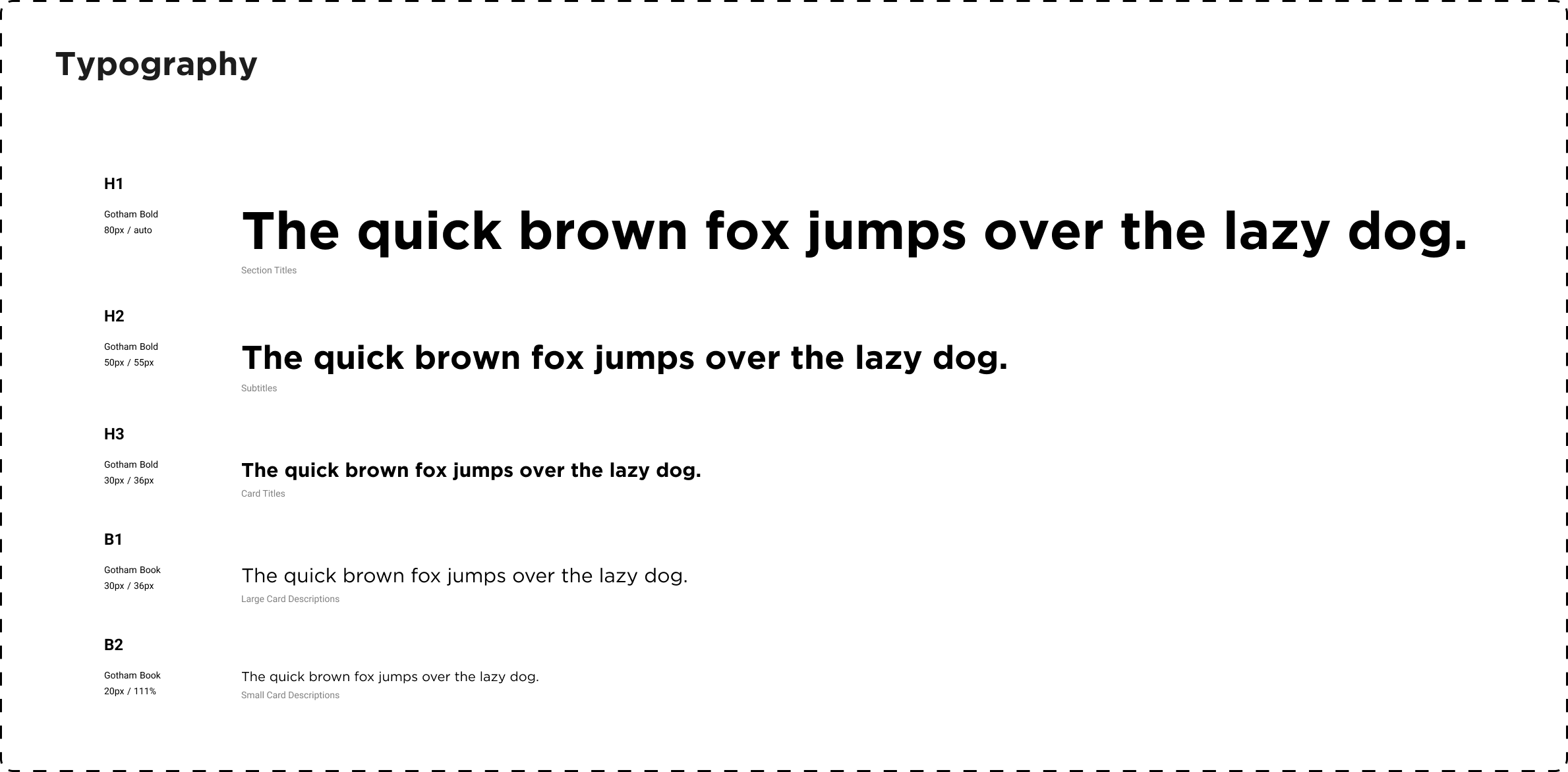 The lead graphic designer decided to use the Gotham type as this typeface has many versatile fonts. Type sizing were in increments of 30, 20, and 10 to be used for visual heirarchy.